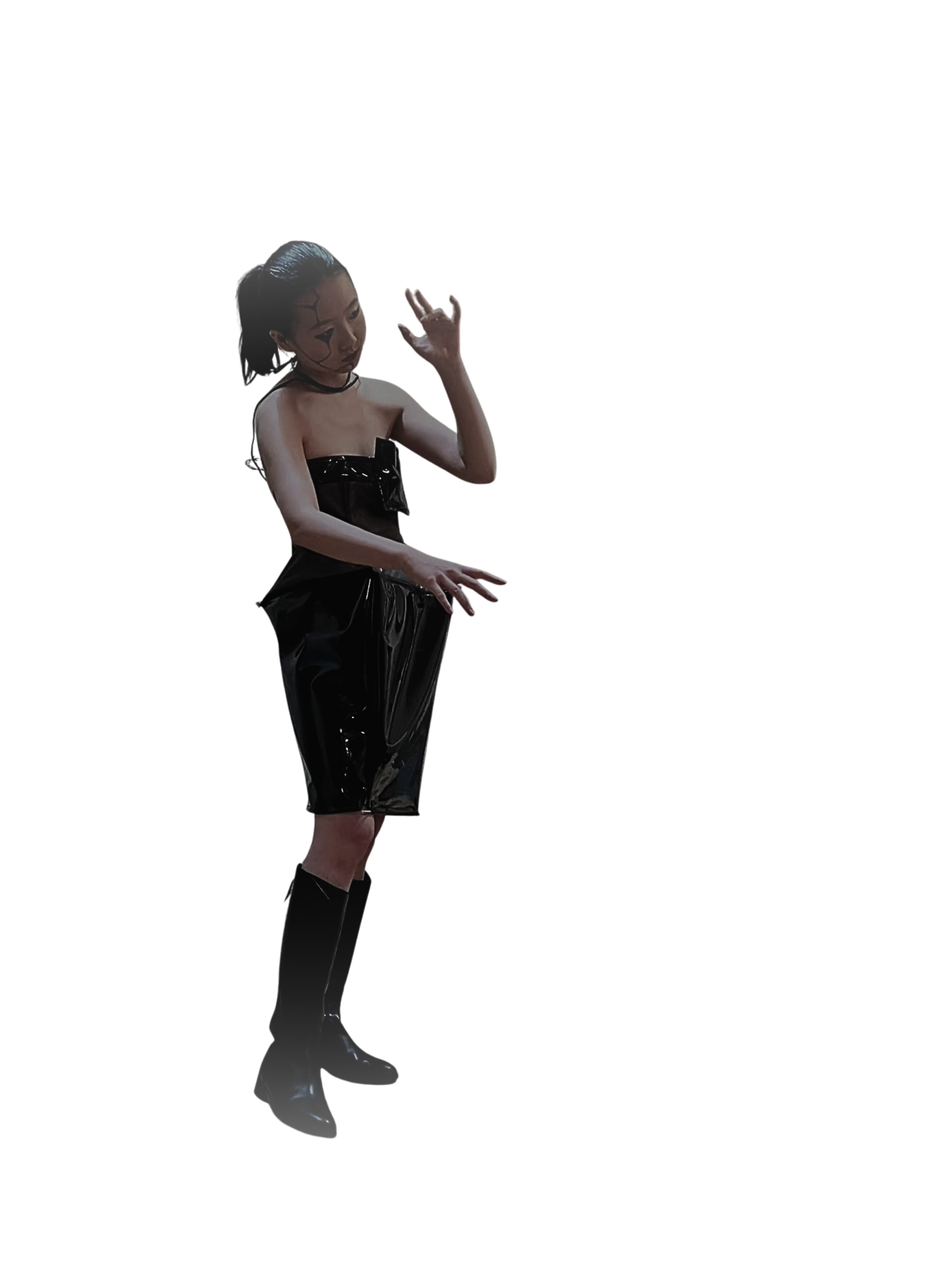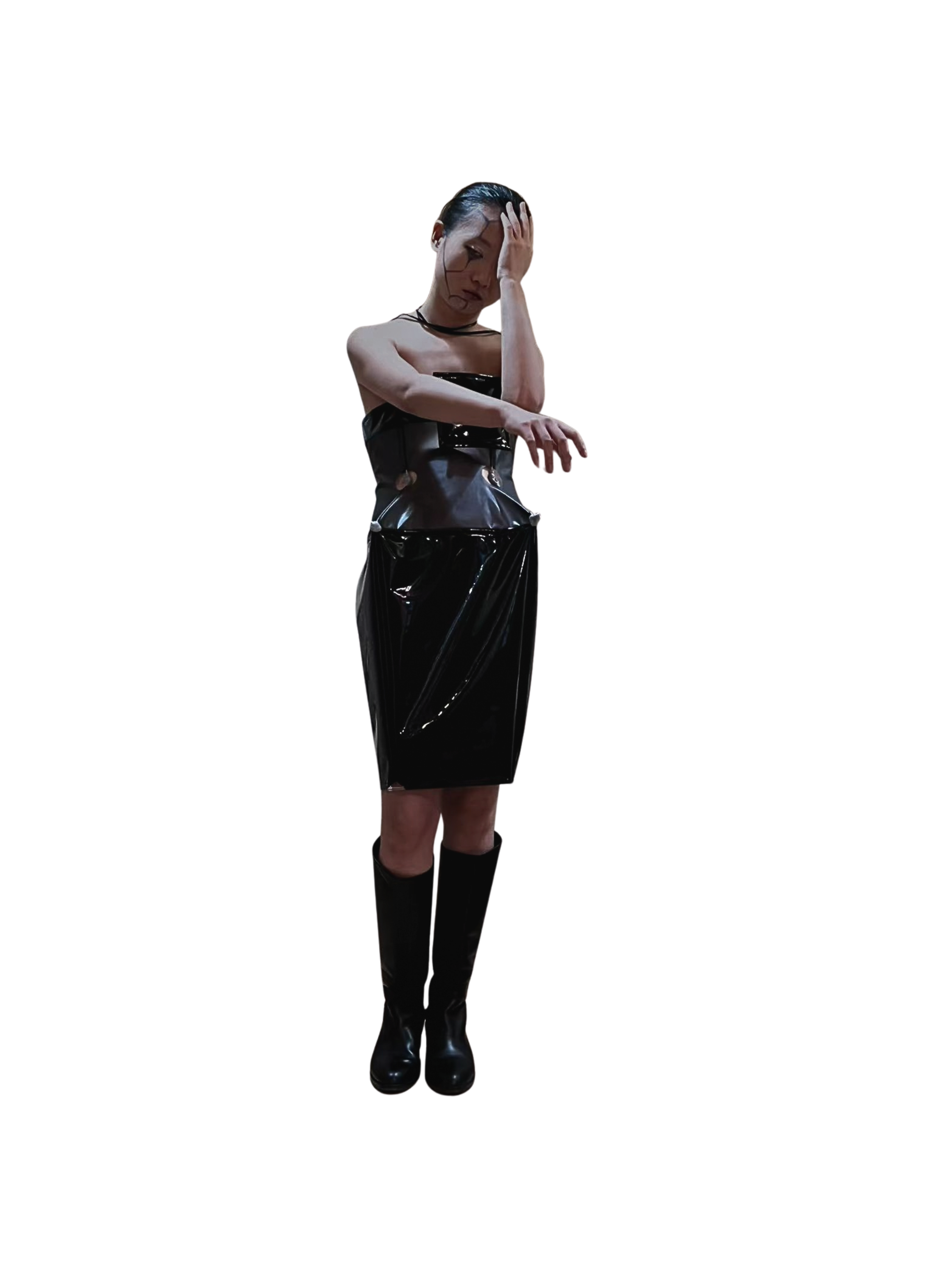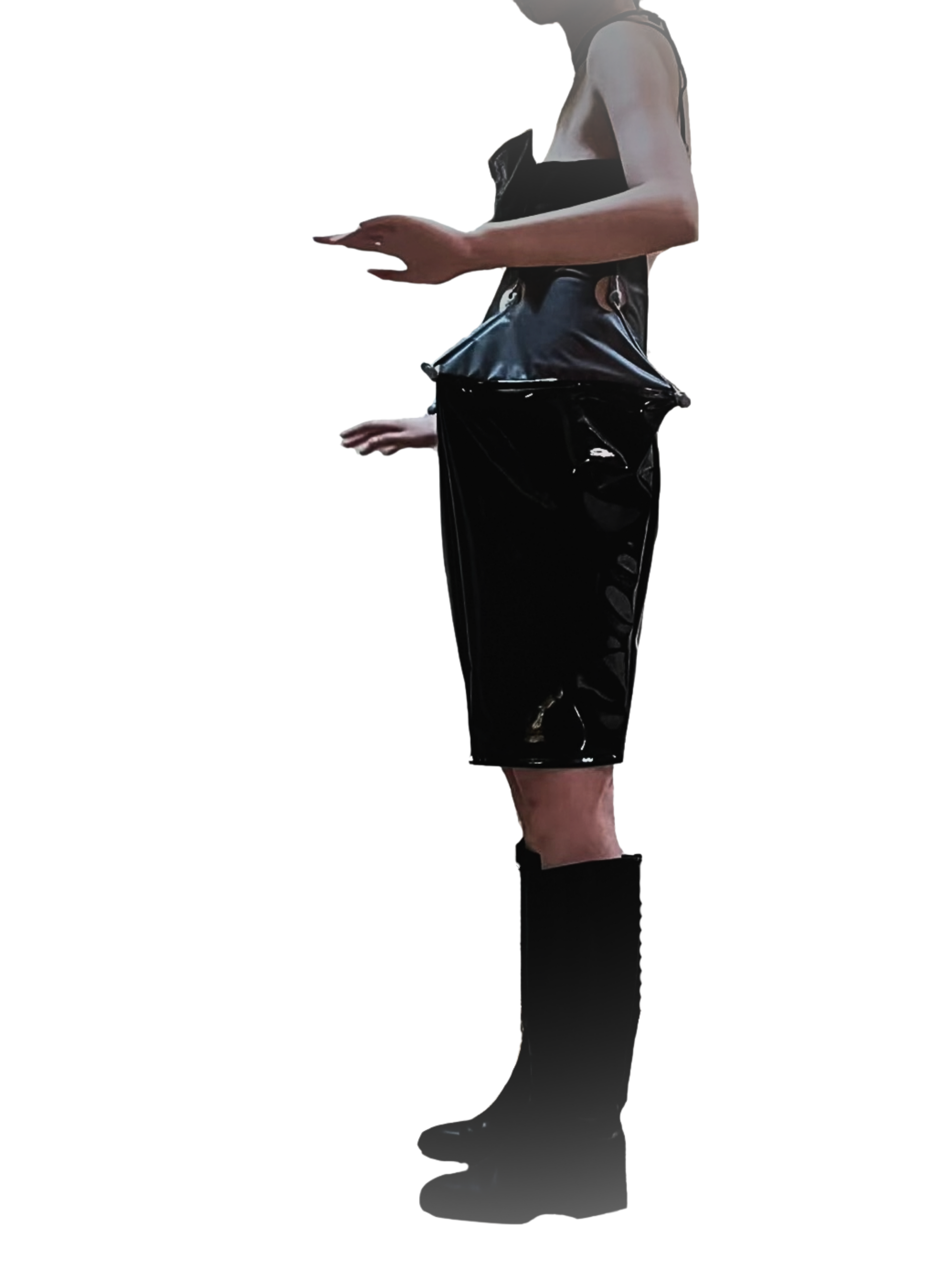 Structural elements are inserted at the waist, interrupting bodily continuity and sealing the body into a controlled spatial configuration.