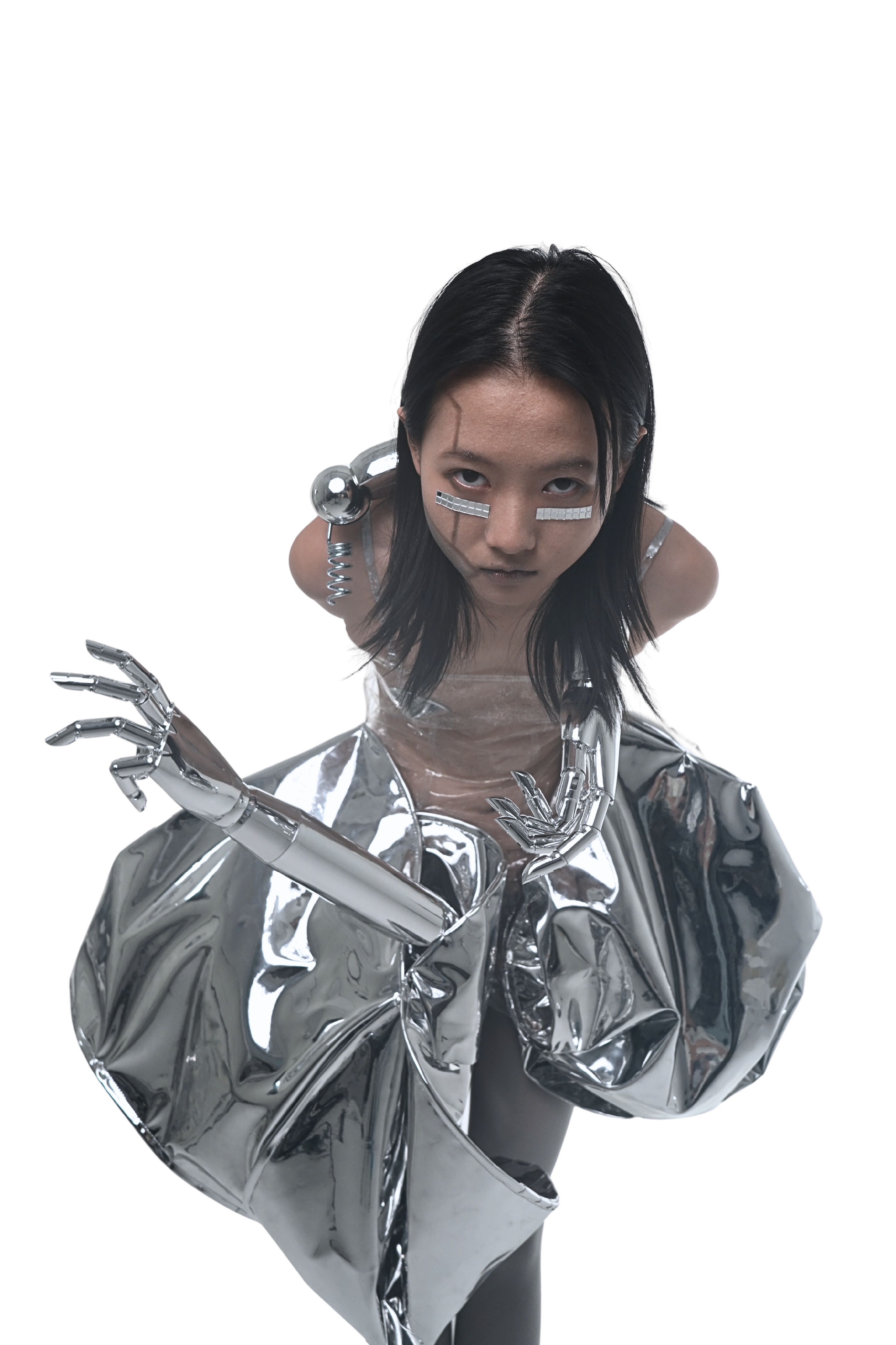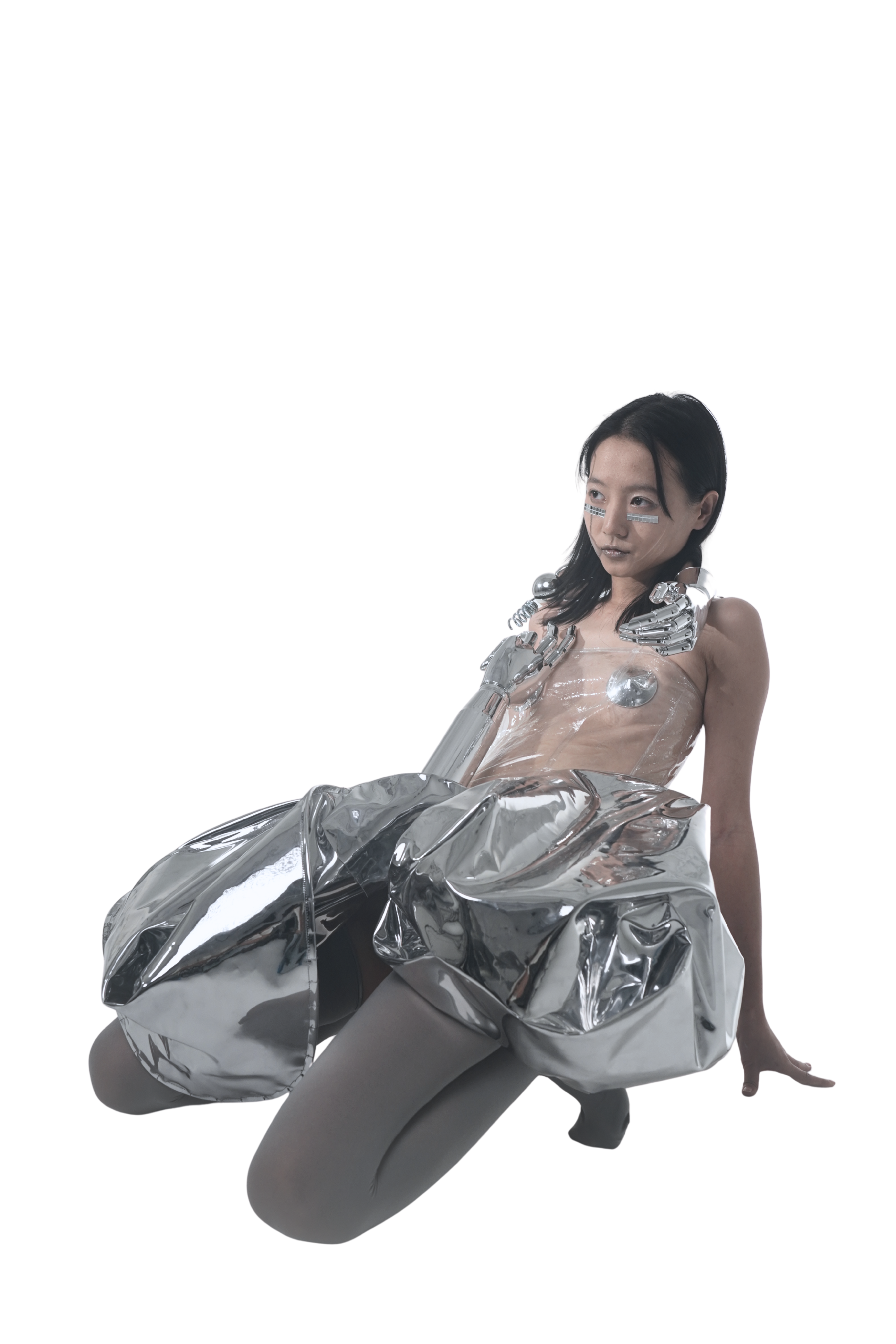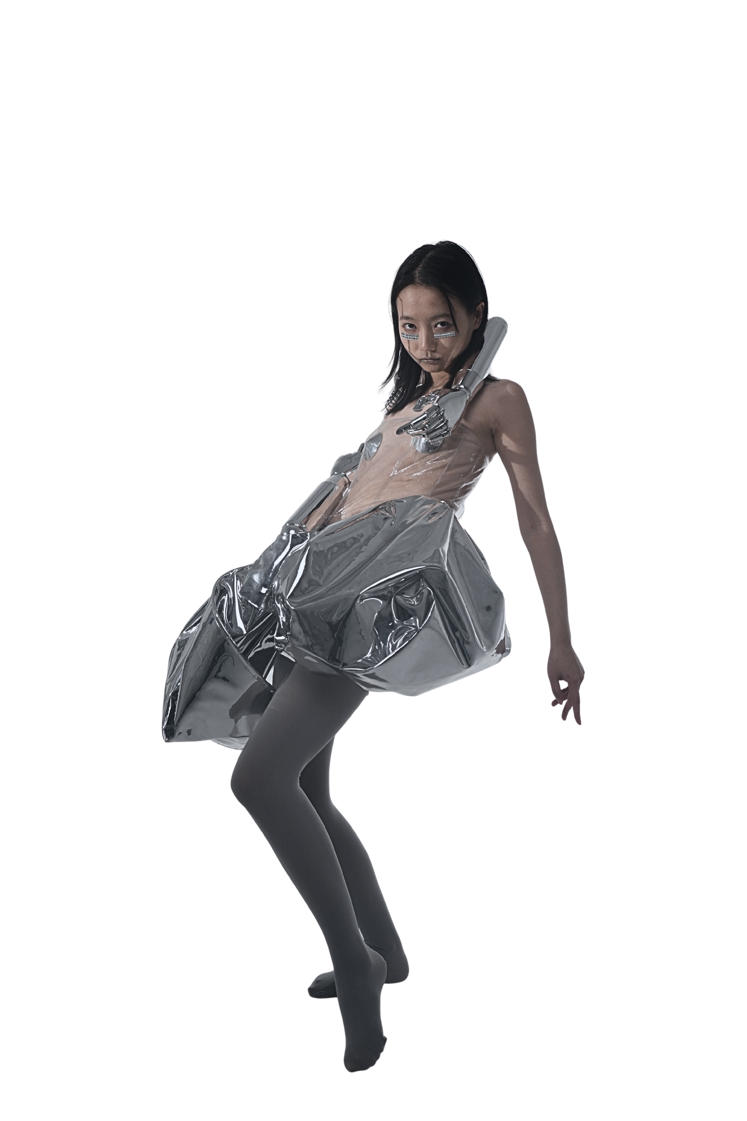 Unlike works that embed structure into the body, this piece suspends the body within an imposed framework, where mechanical extensions and inflated volumes temporarily assume agency.